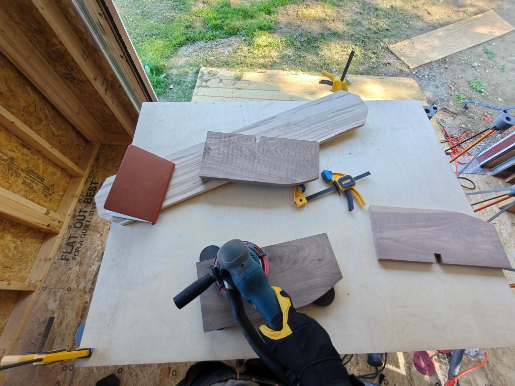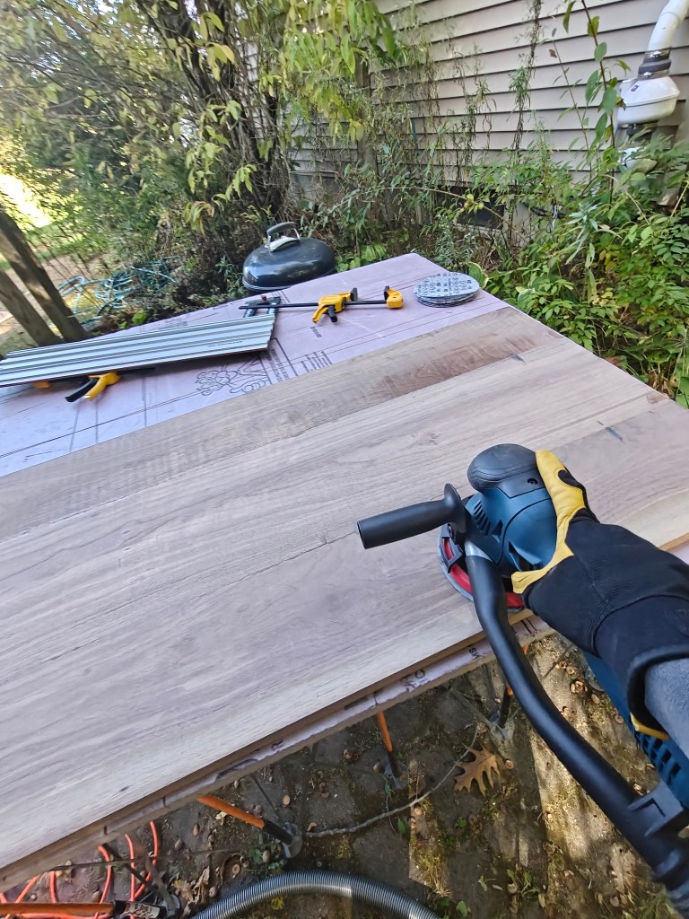 After the glue had cured, I took it outside to cut off the uneven edge, rough-sand it all to relatively flat, and add roundover to the edges with a trim router.