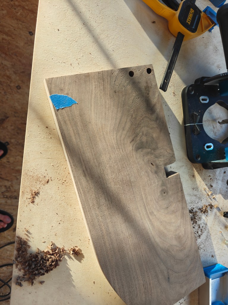 - The inlaid dowels aren’t perfectly aligned. It’s very minor and I think the curvature of the grain actually makes it look worse than it really is, but still, this wouldn’t have happened if I’d drilled with the guide against a straight edge.