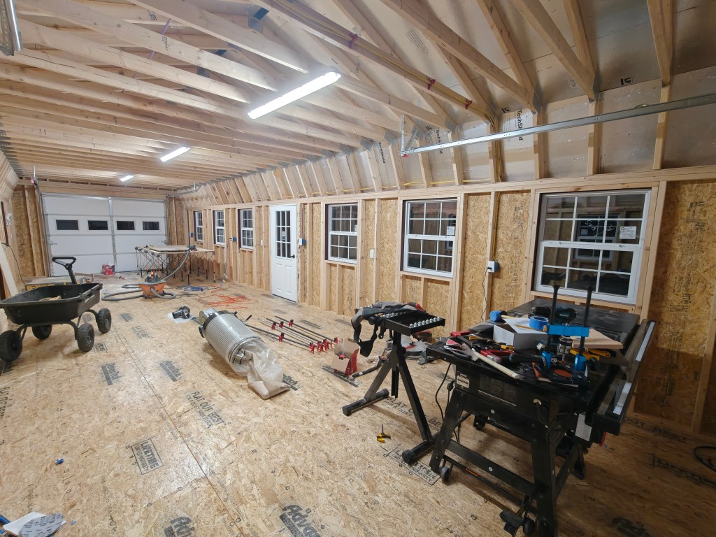 Also, our basement is a pretty terrible place for woodworking — low light, low ceilings, very little airflow. Luckily, earlier in the summer, we’d purchased a shed (way cheaper than building an extension) for me to use to build out my shop, and the electricians had finally gotten around to wiring it: