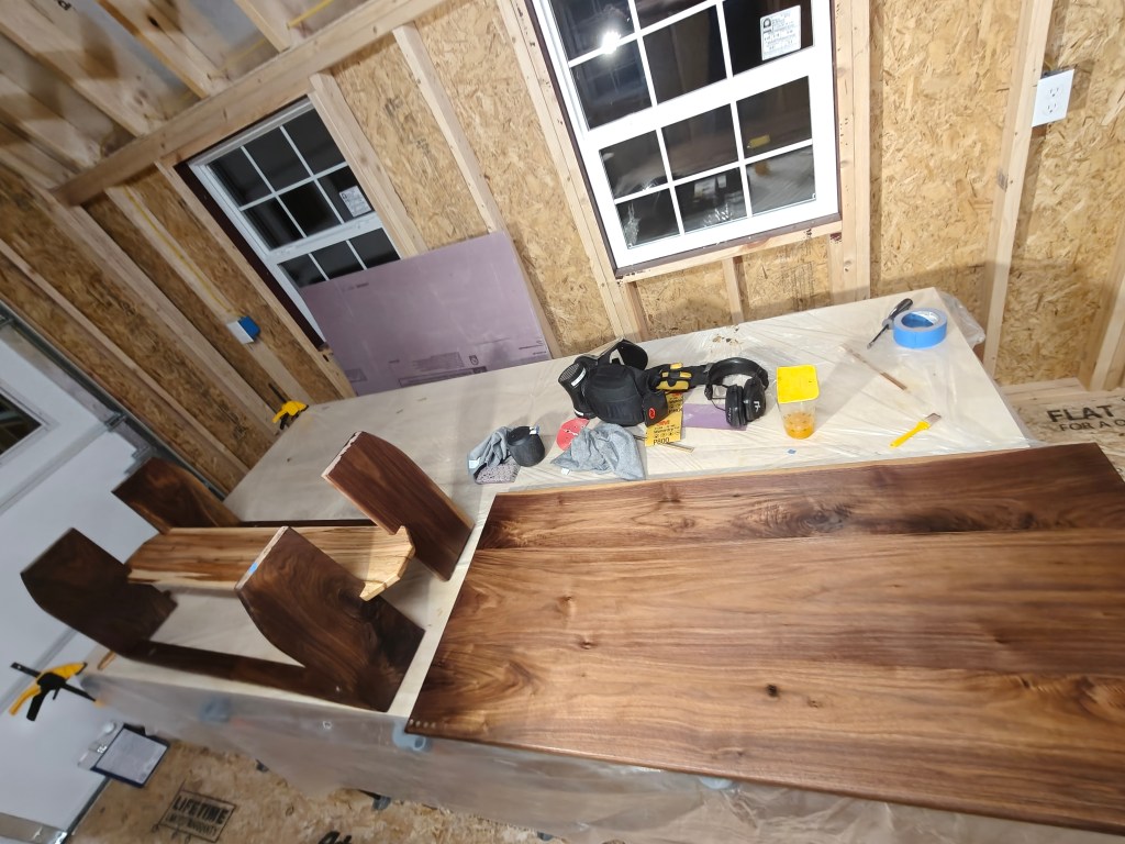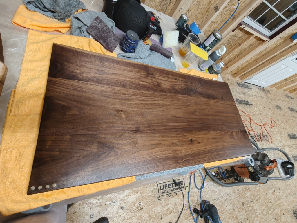 To finish the table, I used Rubio Monocoat for both the legs and the tabletop. “Monocoat” is a bit of a misnomer, though: I did only use one coat on the legs, but walnut is a thirsty wood, and I ended up doing a second coat on the tabletop.